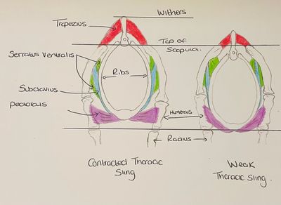 This means the forelimbs have no bony attachment to the axial skeleton but instead the entire forehand is suspended by a complex group of muscles and connective tissues known as the thoracic sling (including serratus ventralis, pectorals, subclavius, and associated structures -see my drawing attempt😂).